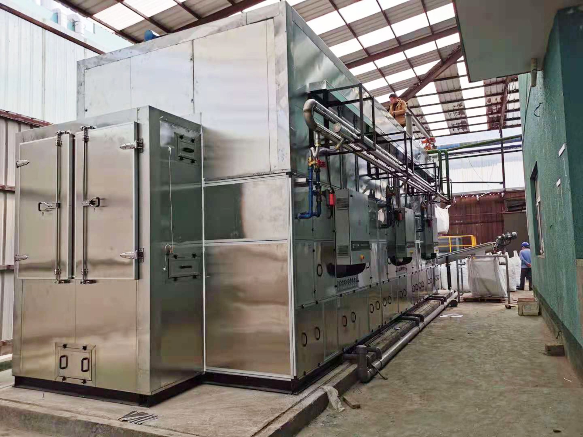 本項目使用了天舒熱泵閉式污泥干化機組SC-200ⅡJ4dXx3一套, 對污泥進行低溫深度干化處理。本項目針對該污水廠產(chǎn)生的電渡污泥進行減量和穩(wěn)定化處理, 每日處理產(chǎn)生含水率65%的污泥25噸, 處理到30%, 大大減低企業(yè)處理成本, 該項目采用了先進的自動除塵技術(shù), 提高了效率, 保證了機組的連續(xù)運行。